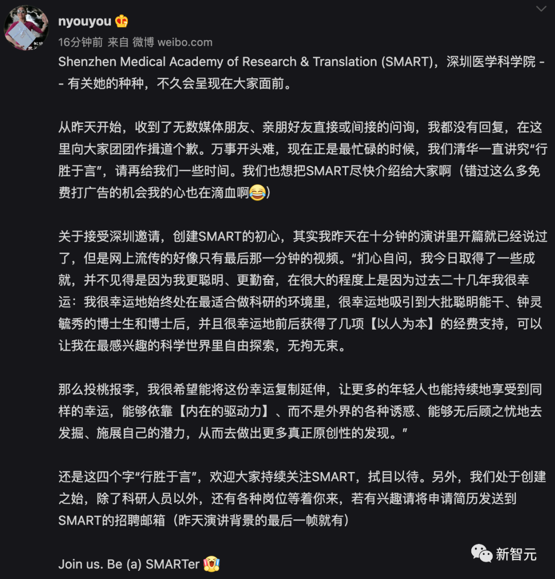 她说,自己是个幸运的人,希望将这份幸运传递给更多年轻人,同时也欢迎大家关注深圳医学科学院 (SMART)。
