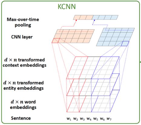 然后类似于图像中 RGB 的三通道,将词、链接实体、上下文实体的向量表示作为CNN多通道的输入。这样 KCNN 的输入就可以表示为
