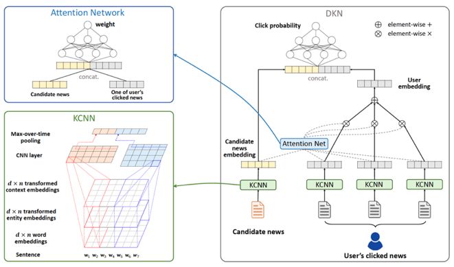 笔者认为,DKN 的特点是融合了知识图谱与深度学习,从语义层面和知识两个层面对新闻进行表示,而且实体和单词的对齐机制融合了异构的信息源,能更好地捕捉新闻之间的隐含关系。利用知识提升深度神经网络的效果将会是一个不错的方向。