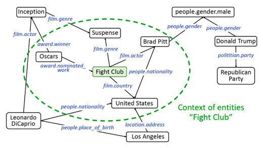 首先将标题拆成一组词,然后将标题中的词与知识库的实体进行链接。如果可以找到词所对应的实体,那么再接着找出距离链接实体一跳之内的所有邻接实体,并将这些邻接实体称之为上下文实体。寻找上下文实体的过程如下图所示。