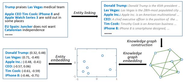 这样,根据新闻标题可以得到三部分的信息,分别是词,链接实体,以及上下文实体。利用 word2vec 模型可以得到词的向量表示,利用知识图谱嵌入模型(这里用的 TransD)可以得到知识库实体的向量表示。其中,链接实体的表示就是 TransD 的训练结果,如果链接不上就 padding。上下文实体的表示就是对多个实体的表示进行平均,如果前一步没有链接实体这里也同样 padding。由此分别得到了词、链接实体、上下文实体的向量表示。