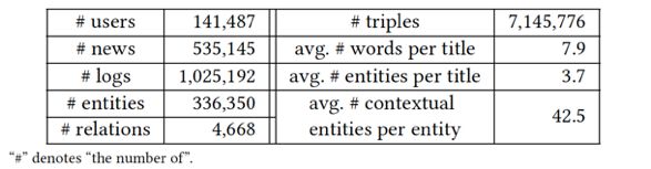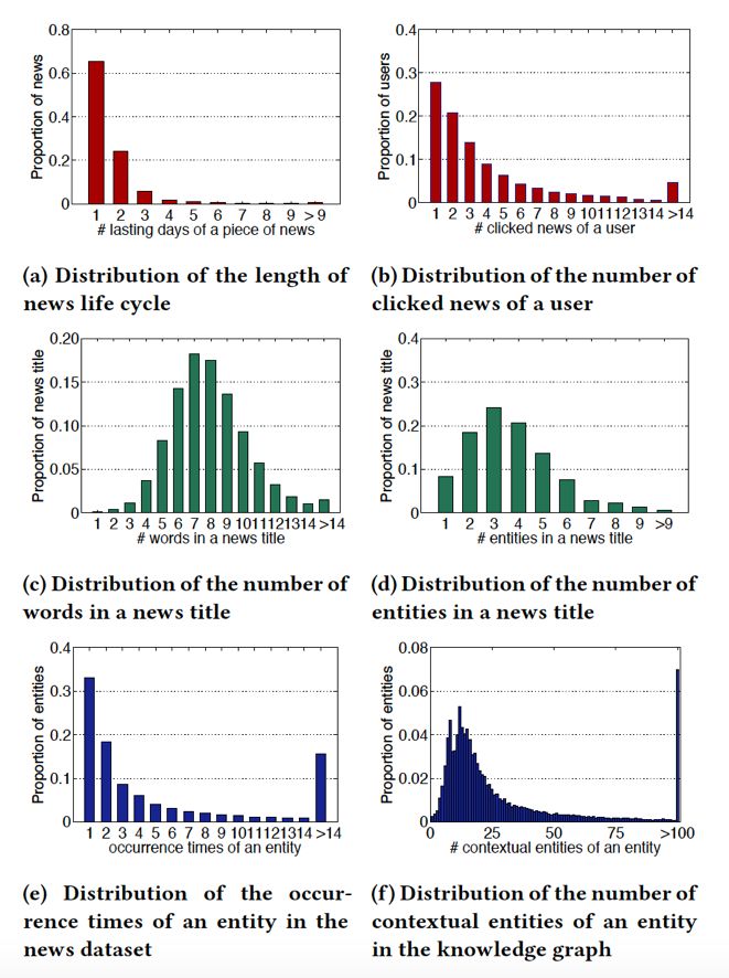 这篇文章的数据来自 bing 新闻的用户点击日志,包含用户 id,新闻 url,新闻标题,点击与否(0未点击,1点击)。搜集了 2016 年 10 月 16 日到 2017 年 7 月 11 号的数据作为训练集。2017年7月12号到8月11日的数据作为测试集合。使用的知识图谱数据是 Microsoft Satori。以下是一些统计数据以及分布。