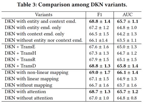 下面这张表展示了 DKN 本身的一些变量对实验结果的影响