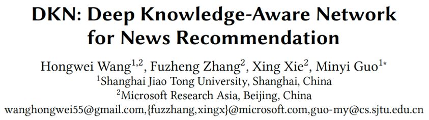 Citation: Wang H, Zhang F, Xie X, et al. DKN: Deep Knowledge-Aware Networkfor News Recommendation[J]. 2018.