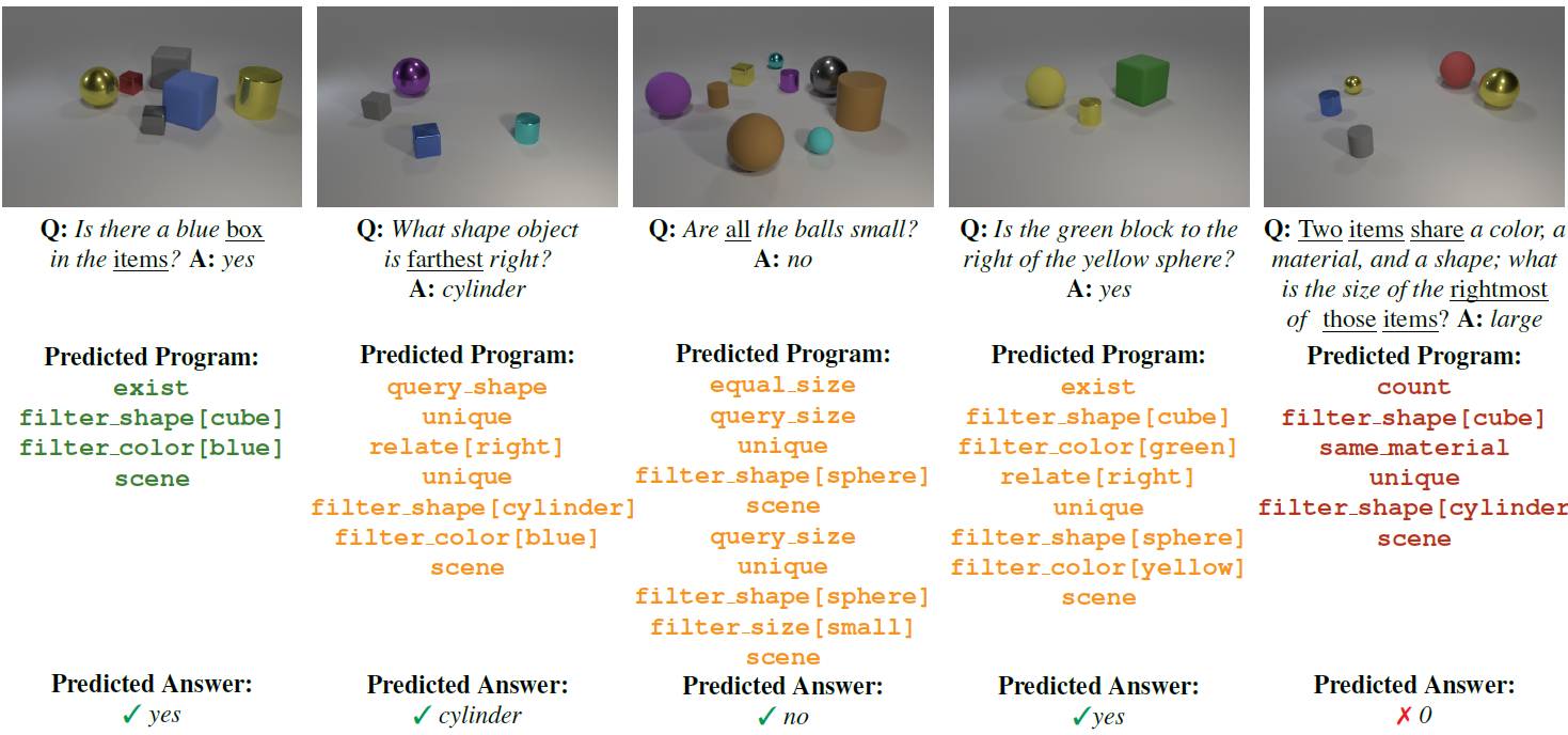 图 7. CLEVR-Humans 数据集中的问题示例,以及新模型预测的程序和答案。没有出现在 CLEVR 中的问题被加上了下划线。一些预测的程序与问题的语义完全匹配(绿色);一些程序与问题语义非常匹配(黄色);一些程序与问题无关(红色)。