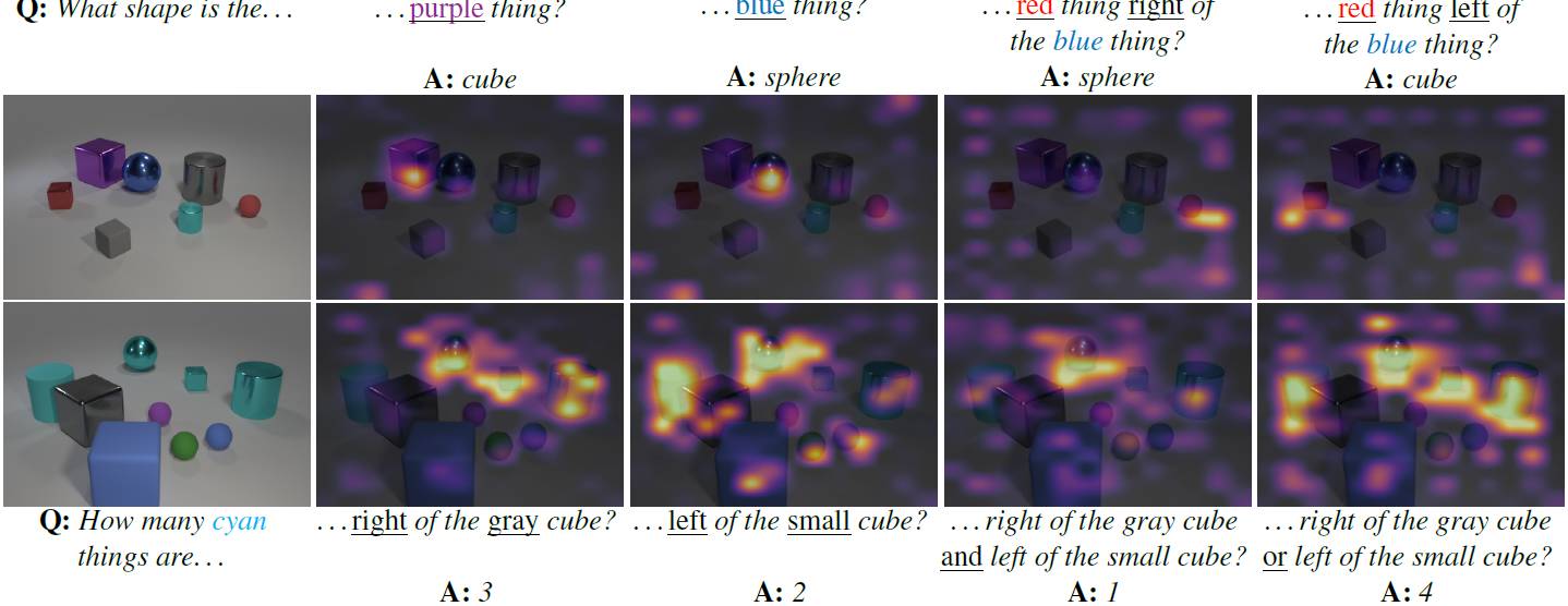 图 3. 模型对预测答案最终特征图的分数之和进行了规范化和可视化。从左至右,每个问题都会向程序增加一个模块,在上图中,增加的模块用下划线表示。中间的可视化图说明了当执行问题回答的推理时模型所关注的热点区域。