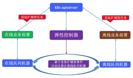 (2)在线业务缩容时,弹性控制器确保节点空载状态(整机部署的业务缩容之后直接空载)之后 会将在线节点自动迁移到离线任务队列,离线业务部署控制器会自动提交并运行一些训练任务;