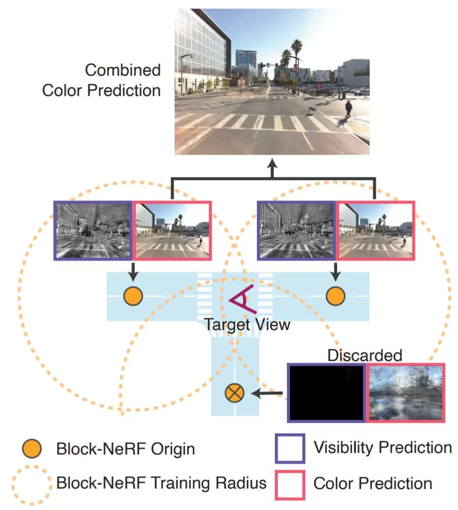 为了应对这些挑战,研究者提出将大型环境划分为多个单独训练的 Block-NeRF,然后在推理时动态渲染和组合。单独建模这些 Block-NeRF 可以实现最大的灵活性,扩展到任意大的环境,并提供以分段方式更新或引入新区域的能力,而无需重新训练整个环境。要计算目标视图,只需渲染 Block-NeRF 的子集,然后根据它们相对于相机的地理位置进行合成。为了实现更无缝的合成,谷歌提出了一种外观匹配技术,通过优化它们的外观嵌入,将不同的 Block-NeRF 进行视觉对齐。