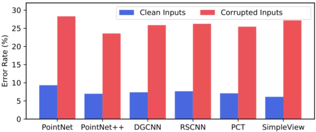 实验表明,目前具有代表性的 3D 点云识别模型(比如:PointNet、PointNet++、DGCNN 以及 PCT)在 ModelNet40-C 上的错误率比在原本 ModelNet40 数据集上的错误率高出超过 3 倍,如下图 1 所示。这证明了点云深度模型框架仍然非常容易受到常见失真的影响。