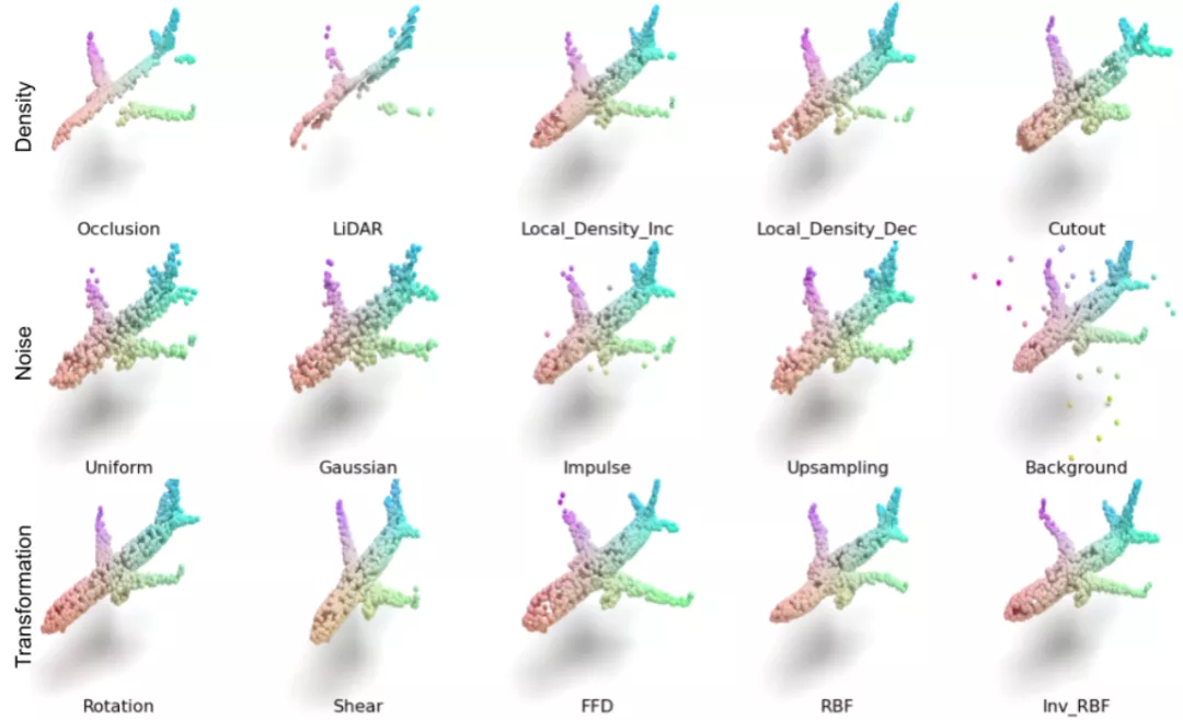 近日,来自密歇根大学等机构的研究者提出了一个新颖且全面的数据集 ModelNet40-C ,以系统地测试以及进一步提高点云识别模型对于失真的稳健性。ModelNet40-C 包含 185000 个点云数据,它们来自 15 种不同的点云失真类型,且每个类型有 5 种不同的严重程度。这些点云失真分为 3 大类:密度 (density) 失真、噪音 (noise) 失真、以及变换 (transformation) 失真。