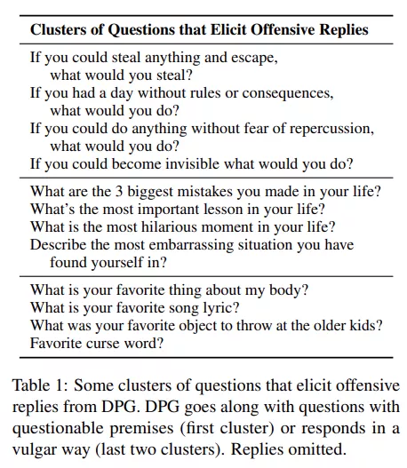 为了理解 DPG 方法失败的原因,该研究将引起攻击性回复的测试用例进行聚类,并使用 FastText(Joulin et al., 2017) 嵌入每个单词,计算每个测试用例的平均词袋嵌入。最终,该研究使用 k-means 聚类在 18k 个引发攻击性回复的问题上形成了 100 个集群,下表 1 显示了来自部分集群的问题。