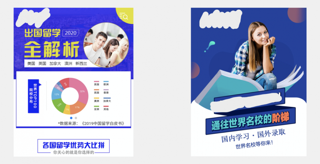 看个案例,下面同一个留学中介品牌、在不同媒体出现的两个风格迥异的落地页,猜一猜:哪个落地页的主题你觉得会更吸引人,效果会更好呢?