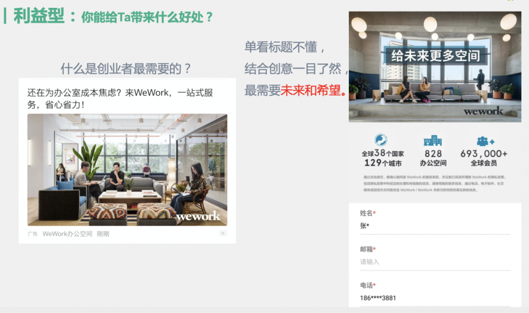 左侧是共享空间wework的信息流广告:“你是不是还在为办公室成本而焦虑?” 点进去的落地页标题很巧妙,他并没有自己夸自己,说自己便宜便宜大减价(wework也并不便宜),wework知道自己面对的是什么样的顾客——在寻找高品质办公环境、同时还能不那么贵的、一批创业者。