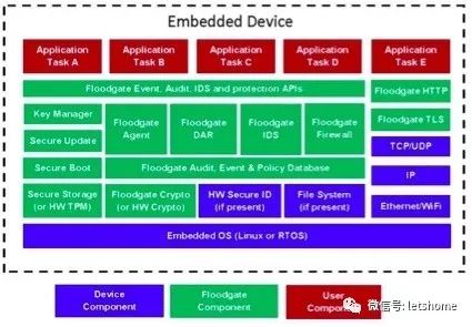 Floodgate IDS对嵌入式Linux和RTOS设备提供保护,其能检测出固件、配置信息和静态数据的改变。Floodgate Secure Boot确保只有从OEM认证的固件才允许在这台设备上运行。Floodgate Agent提供对于嵌入式和物联网设备的态势感知、安全事件报告、命令审计日志和安全策略管理,同时也提供与企业安全管理系统的集成。