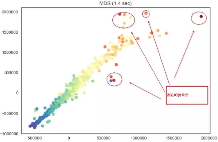 以我最近做的一个项目为例,我们用MDS将一个8维的数据在2维上展示出来。我们似乎可以直观的看到一些近似线性的关系,以及一些看起来“很可疑”的点,我在图中标注了出来。