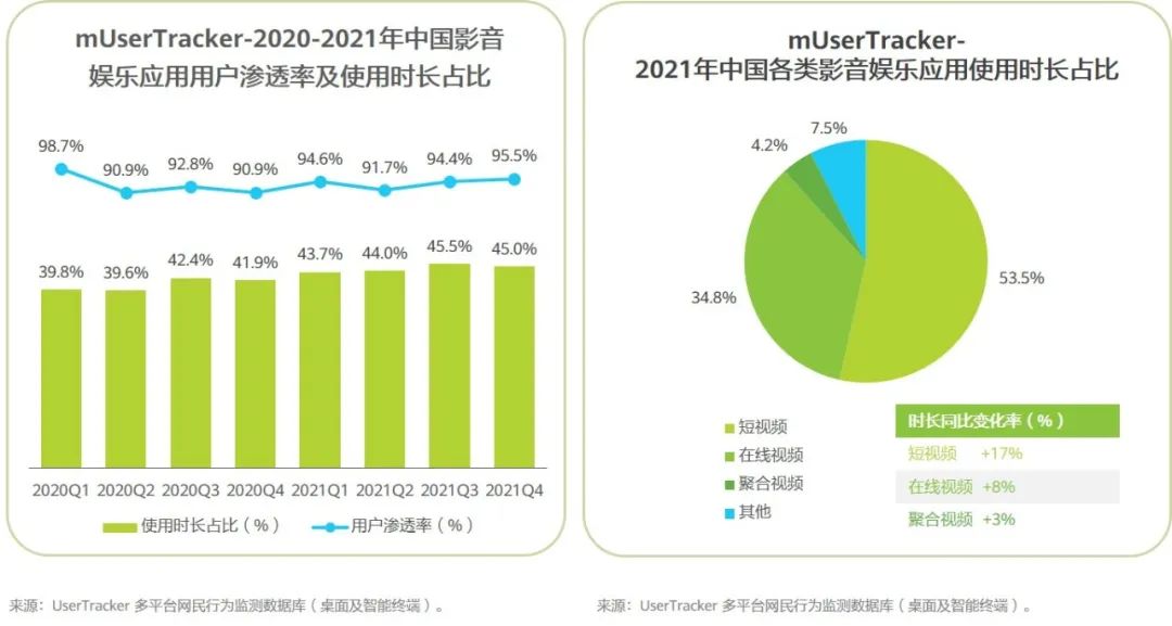 首先在影音娱乐行业中,诸多指标增长可观。2021 年短视频应用使用时长增长17%,短视频应用使用时长占影音娱乐应用时长的比例达53.5%。以爱奇艺、腾讯视频为代表的在线视频使用时长增长8%,用户黏性增强。同时在 2021 年影音娱乐应用保持90%以上的高渗透率。每月用户在使用移动设备的时长中43%-45%的时间都在使用影音娱乐应用。