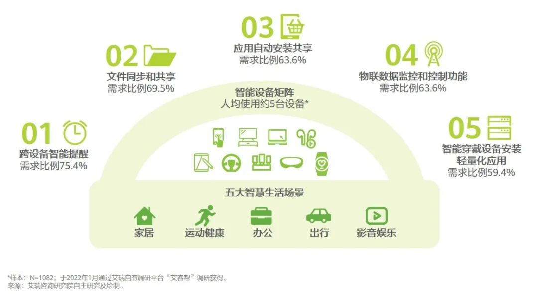 白皮书中指出,随着智能设备不断深入各大生活场景,用户对跨设备的智能互联有了新的要求,智能提醒、文件同步、应用共享、物联数据打通以及在智能穿戴设备上安装轻量化应用的用户需求已经达60%及以上。