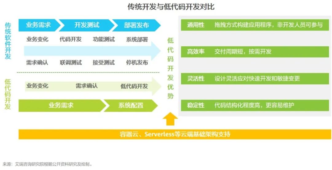 低代码意指利用快速开发的方式,使用最少的代码、以最快的速度来交付应用程序,除了快速满足常见场景需求外,尤其适于满足用户的长尾功能需求。