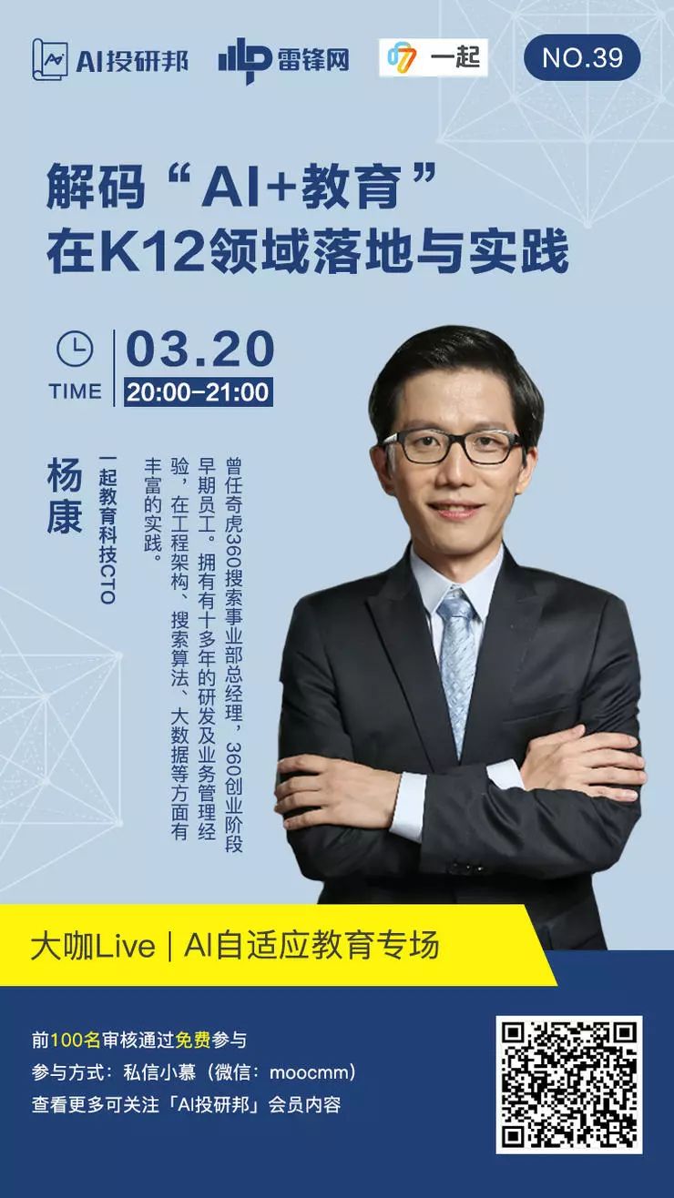 2018年3月20日,一起作业宣布完成2.5亿美金E轮融资,迈入10亿美金估值独角兽行列,同时,将公司品牌从“一起作业”改为“一起教育科技”。【大咖Live】AI自适应教育专场第二期,2019年3月20日(本周三)20:00,独角兽一起教育科技CTO杨康将带来关于“解码「AI+教育」在K12领域的落地与实践”的主题分享,详解一起教育科技在AI+教育方面的实践经验。