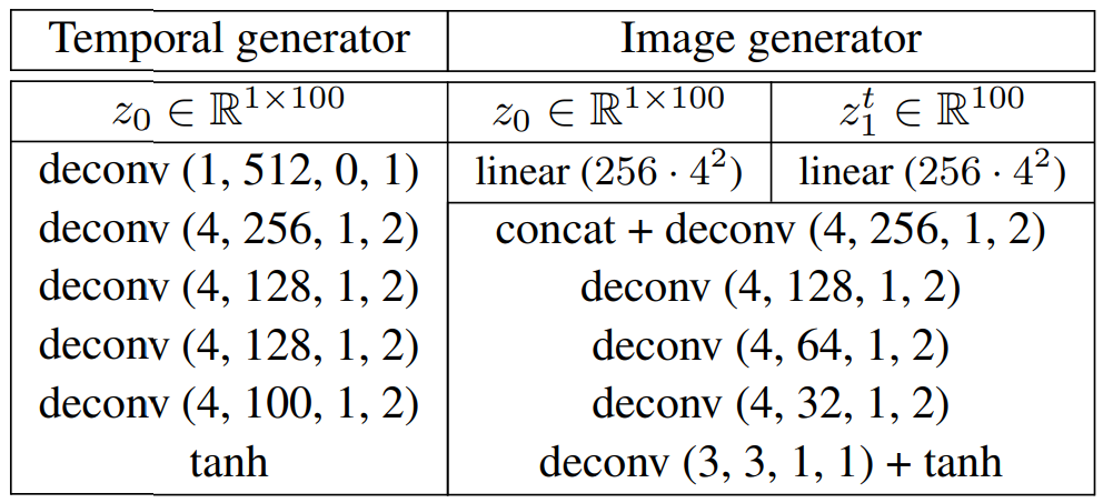 One Stream Architecture: 将时空卷积与分层卷积结合起来,生成视频。三维卷积提供了空间和时间上的不变性,而分层卷积可以在深度网络中有效地进行上采样,确保z低维。使用4×4×4卷积的五层网络,步长为2,只有第一层使用2×4×4卷积(时间×宽度×高度)。