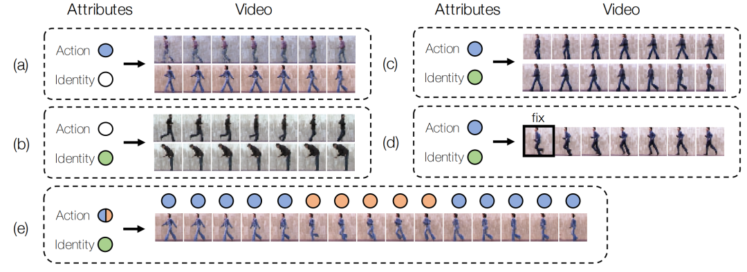 图8. 使用属性控制的视频生成。使用一个包含固定数量控制信号的半监督的潜在空间来引导生成过程。将 "动作 "和 "身份 "中的一个(a-b)或两个(c)属性设置为所需的或推断的类别(彩色圆圈)限制了生成过程,利用剩余的自由度来合成不同的视频样本。在(d)中,对两个属性以及第一帧的调节有效地消除了生成过程中的所有不确定性(自由度)。在(e)中,在第6和第11帧诱导了从 "走 "到 "跑 "再回到 "走 "的属性转换,从而在生成的视频中产生了图示的相应转换