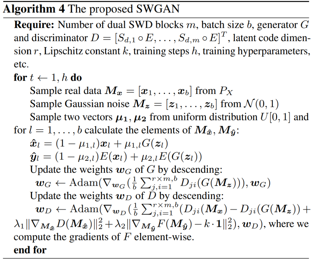 为了满足1-Lipschitz约束,给鉴别器中的所有线性层添加一个约束,以满足权重参数W的spectral norm 等于或小于1。这意味着权重矩阵的奇异值都是1或小于1。在参数更新后进行奇异值分解(SVD),将所有大于1的奇异值替换为1,然后用它们重建参数。将同样的操作也应用于卷积层,将权重参数中的高阶张量解释为一个矩阵Wˆ,称这些操作为奇异值剪切(Singular Value Clipping,SVC)。