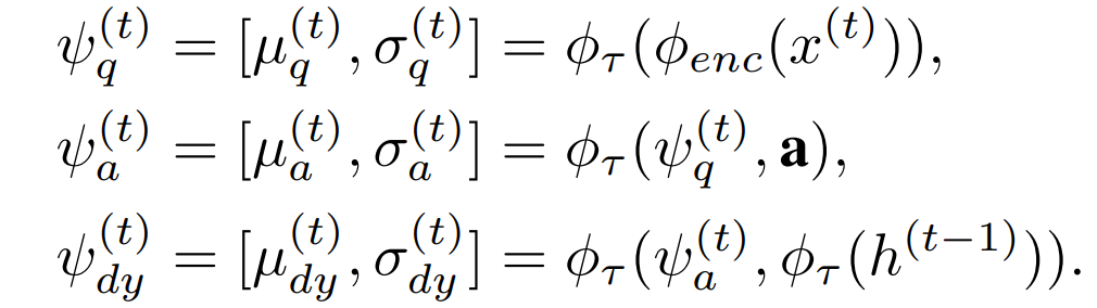 在时间步长t的潜在变异表征是以LSTM的状态变量h(t-1)为条件的。这种额外的依赖性利用了视频在时间上高度一致的事实,防止两个连续帧之间的内容和运动变化过快。由于先验分布代表了模型在时间点t的预测和信念,考虑到以前的所有信息,它不应该是一个固定的高斯(如静态VAE的情况),而是遵循分布