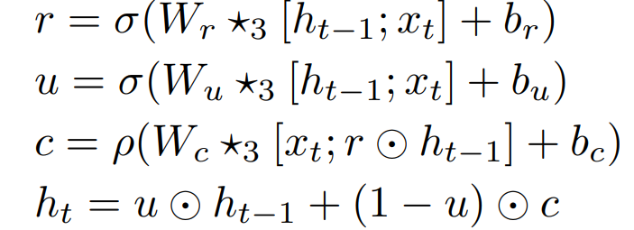 G的层常数对于64×64的视频来说是[8, 8, 8, 4, 2],对于128×128来说是[8, 8, 8, 4, 2, 1]。第i层的宽度由ch和第i个常数的乘积给出,在G的残差网络之前的所有层都使用初始层的乘积,把它和ch的乘积称为ch0。对于64×64分辨率的视频,DVD-GAN中的ch为128,否则为96。对于64×64分辨率的视频,DT和DS的相应ch列表为[2, 4, 8, 16, 16],对于128×128的视频,则为[1, 2, 4, 8, 16, 16]。G的输入包括一个高斯潜在噪声z∼N(0, I)和一个所需类别y的学习线性嵌入e(y),两个输入都是120维的向量。G开始计算[z; e(y)]到[4, 4, ch0]形张量的仿射变换(在图10中表示为1×1卷积)。[z; e(y)]被用作整个G的所有类别条件下的批量归一化层的输入。然后将其作为卷积门控递归单元的输入(在我们想要生成的每一帧),该单元对输入x_t和先前输出h_t-1的更新规则如下