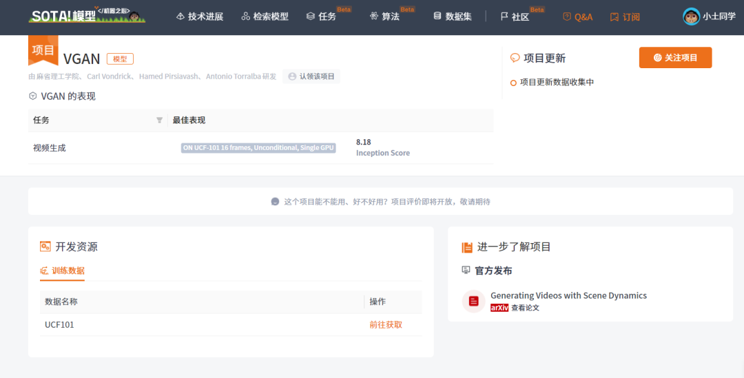 | VGAN | 前往SOTA!模型平台获取实现资源:https://sota.jiqizhixin.com/project/vgan |