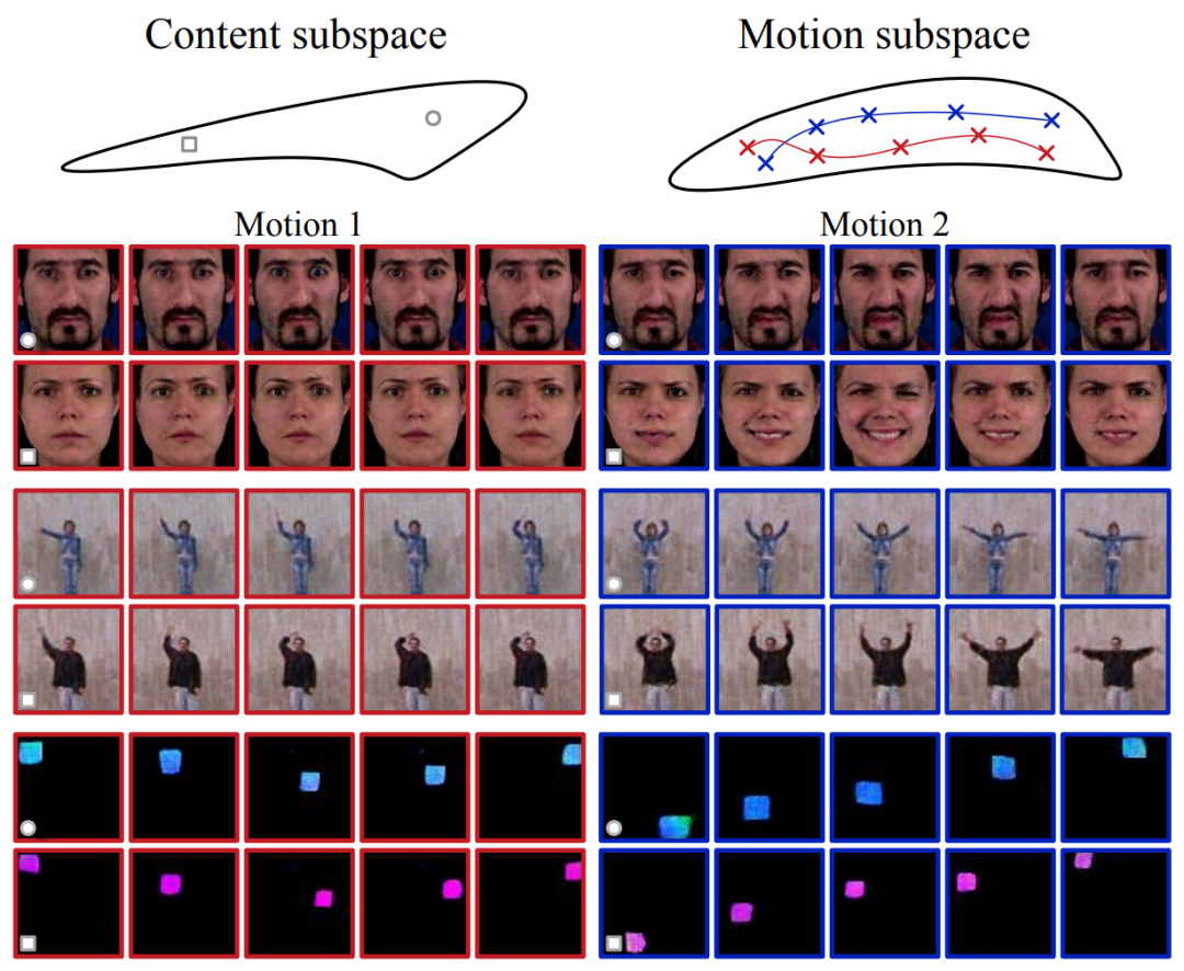 图3. MoCoGAN采用了运动和内容分解的表示方法来生成视频。它使用一个图像潜在空间(每个潜在变量代表一个图像)并将潜在空间划分为内容和运动子空间。通过对内容子空间中的一个点进行采样并对运动子空间中的不同轨迹进行采样,可以生成同一物体的不同运动的视频。通过对内容子空间中的不同点和运动子空间中的相同运动轨迹进行采样,可以生成不同物体做相同运动的视频