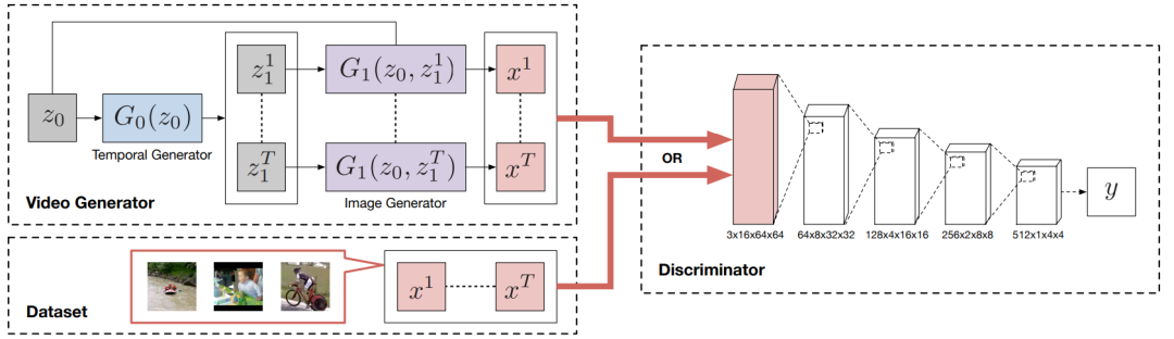 其次,它必须能够识别帧之间的真实运动。设计鉴别器,使其能够用同一模型解决这两个任务。使用一个五层的时空卷积网络,其内核为4×4×4,这样隐藏层就可以同时学习视觉模型和运动模型。该架构与生成器中的前景流相反,用分层卷积取代分层卷积(下采样而不是上采样),并将最后一层替换为输出二元分类(表征真实与否)。