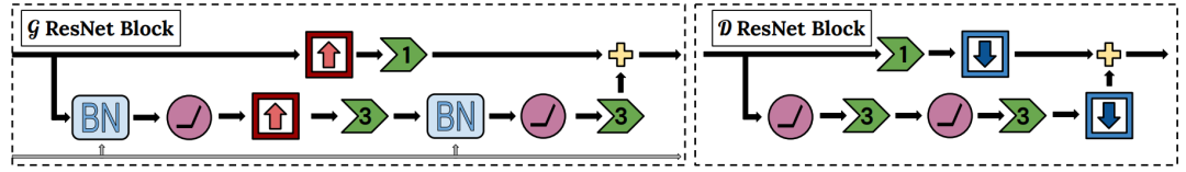 在这些方程中,σ和ρ分别是元素的sigmoid和ReLU函数。括号用于表示特征串联。这个RNN每帧unrolled一次。在这里,时间维度与批处理维度相结合,因此每一帧都独立地通过这些块进行。这些区块的输出的宽度和高度尺寸都是双倍的(我们在第一个区块中跳过了上采样)。这样重复多次,将一个RNN+残差组的输出作为下一个组的输入,直到输出的张量具有所需的空间尺寸。在计算批量归一化统计时,不在时间维度上进行还原。这可以防止网络利用批量归一化层在各时间段之间传递信息。空间判别器DS的功能与BigGAN的判别器几乎相同,在图11中给出了残差块的概述。对均匀采样的k个帧(默认为k=8)中的每一个计算得分,DS的输出是每帧得分的总和。时间鉴别器DT有一个类似的架构,但用一个2×2的平均集合下采样函数φ对真实或生成的视频进行预处理。此外,DT的前两个残差块是三维的,其中每个卷积都被一个内核大小为3×3×3的三维卷积所取代。其余架构与BigGAN一致。
