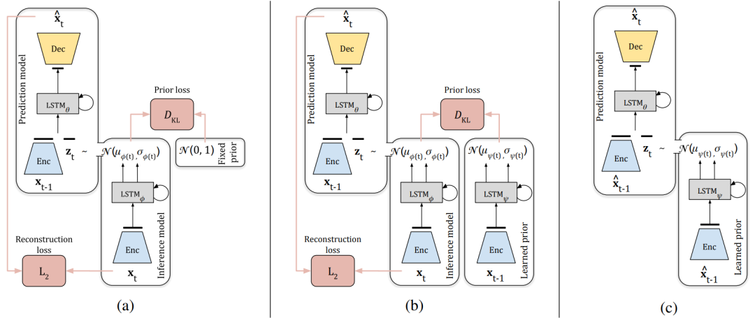 图5. SVG视频生成模型。(a)用固定先验的训练(SVG-FP);(b)用学习先验的训练(SVG-LP);(c)用学习先验LP模型生成。红框表示训练过程中使用的损失函数