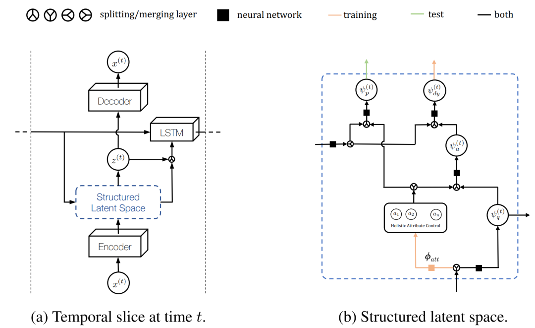 图9. VideoVAE概述,(a) VAE的结构化潜在表示编码了一个条件近似后验,在LSTM的帮助下通过时间传播。(b) 图9a中虚线框的详细说明:在一个分层过程中,整体属性首先与变异近似后验合并,然后与来自LSTM的时间信息整合,有效地产生了一个双条件动态近似后验