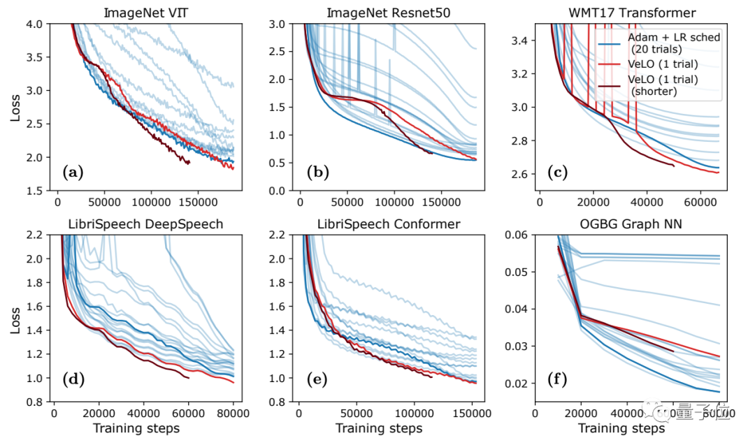 而在6类学习任务(数据集+对应模型)的优化效果上,VeLO在其中5类任务上表现效果都与Adam相当甚至更好: