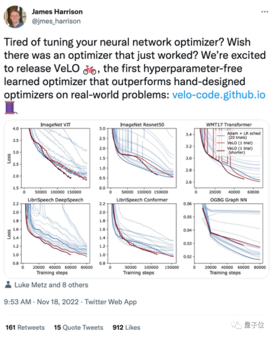 当然,效果也更好。论文作者之一Lucas Beyer将VeLO与其他“重度”调参的优化器进行了对比,性能不相上下: