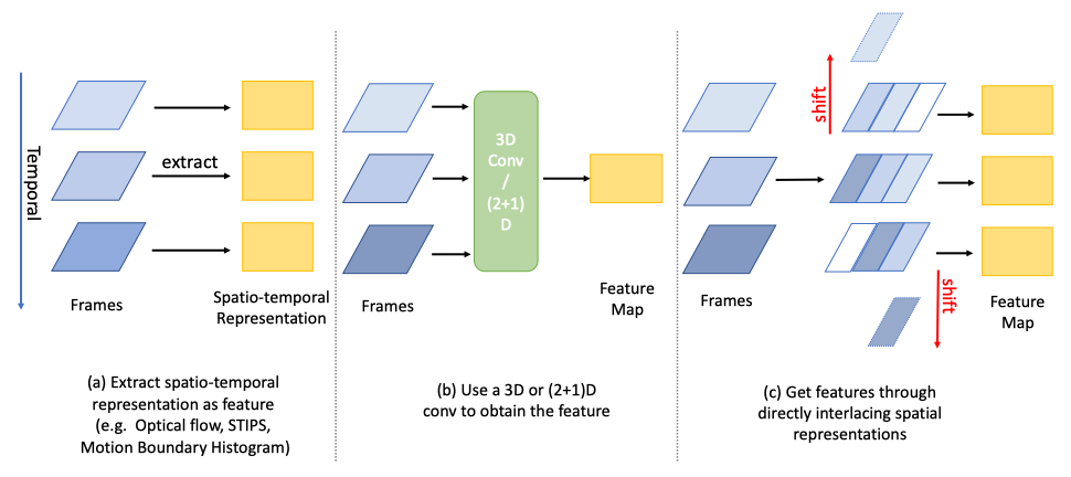 本文提出了一个简单而强大的模块-时序交错网络(Temporal Interlace Network)来尝试解决这个问题。TIN 不学习时间特征,而是通过交错过去到未来以及未来到过去的空间特征来融合时-空信息。