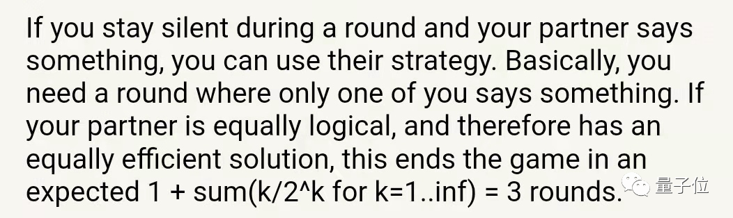 也就是说,他认为在这一谜题中,最重要的是保持“每一轮只有一人执行说话”。如果队友也赞同这一逻辑,那么很快就能结束比赛。
