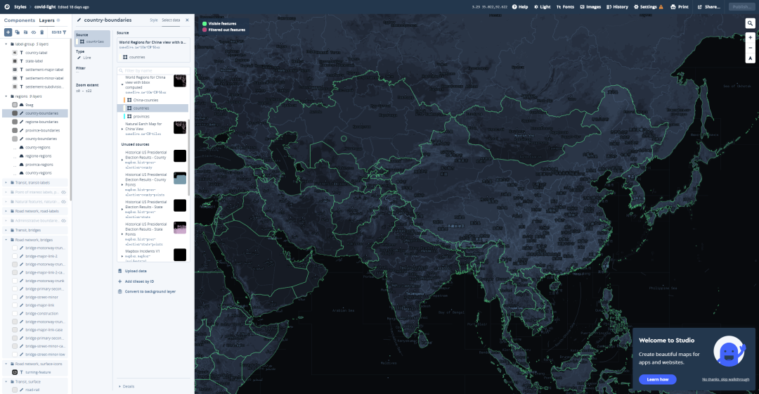 前端渲染有其内在逻辑和流程,以图九中国地理数据为例,数据源包含了区域等特征。基于数据源地图组件会分为不同的层,每层依据不同的渲染规则负责渲染不同的内容。