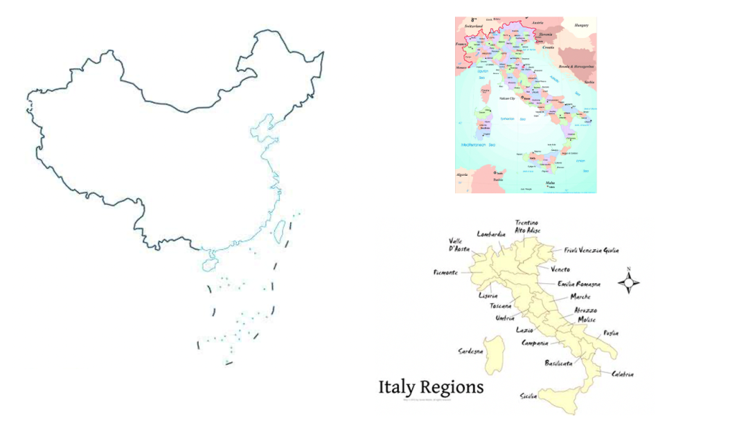 在地理数据的来源上,知识疫图国内和国外分别采集了阿里云、Natural Earth两大数据源。在收集到数据之后,进行地区字段的匹配如Beijing–China|Beijing–北京市,繁体简体转换,中英文对照等地区ID重组工作。虽然Natural Earth有数据完整性等优点,但其数据还存在一些细节需要修正(如图六)。中国地区的修正,主要指九段线、南海诸岛、台湾省、藏南地区等边界线和描述的处理。其他世界地区的数据调整包括(1)区域的重新规划比如意大利、法国等国家,需要以国家-大区-省方式重新合并和调整;(2)更粒度的数据处理比如英国苏格兰、北爱尔兰需要细化出像英格兰一样郡级的数据。