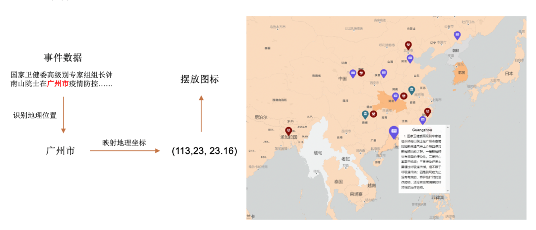 除此之外,知识疫图的疫情地图前端渲染还包括了图十示例的事件,将各类新闻以地图标记的方式放置在疫情地图上,方便用户能够了解全世界在疫情之下各国发生的具体变化。