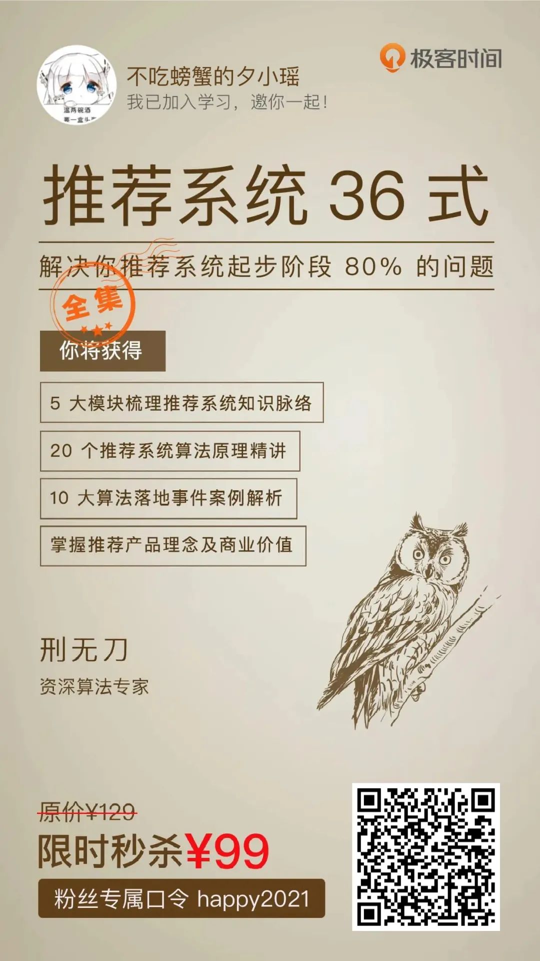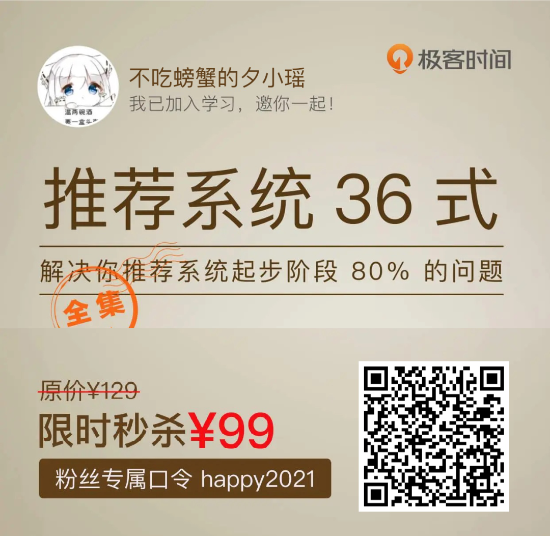 在专栏中,他从 5 大模块出发,梳理了完整的推荐系统知识脉络,精讲了 20 个推荐系统算法原理和 10 大算法落地事件案例,帮你彻底掌握推荐系统。另外,推荐系统要成功,除了技术以外,还要考虑产品理念和商业价值,这部分是专栏里独家分享的内容,也是非常有前瞻性了,这里推荐给你。