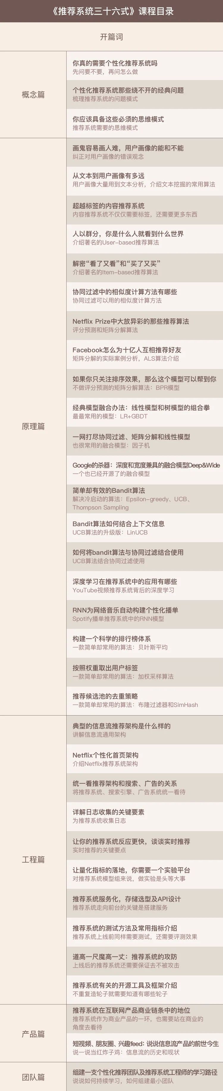 ,几乎涵盖了推荐系统的全部核心知识点,可以帮你建立起对推荐系统的全面认知。