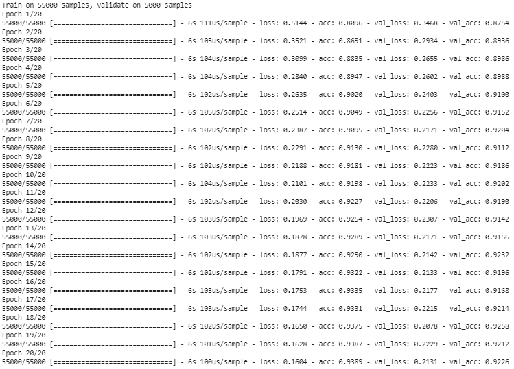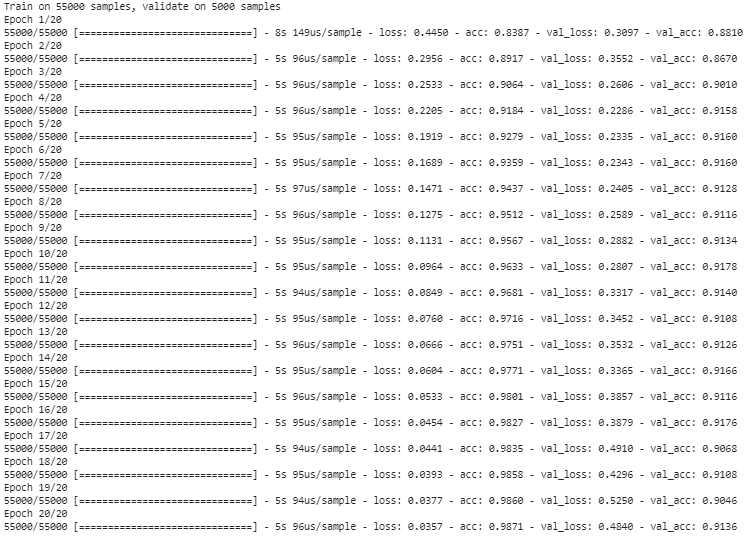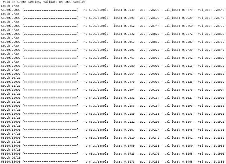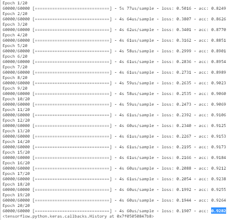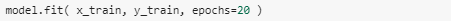 和 Scikit-Learn 一样,Keras 里也用 model.fit() 函数;和 Scikit-Learn 不一样,Keras 会设置要遍历训练数据多少遍,即 epochs,先用 20 遍。