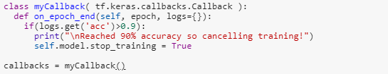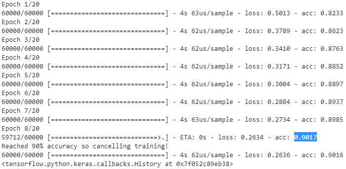 在本例中,我们定义的是 on_epoch_end(),在每期结束式,一旦精度超过 90%,模型就停止训练。