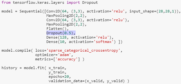 代码和上面一摸一样,在第一个全连接层前加一个 Dropout 层(高亮强调出)。