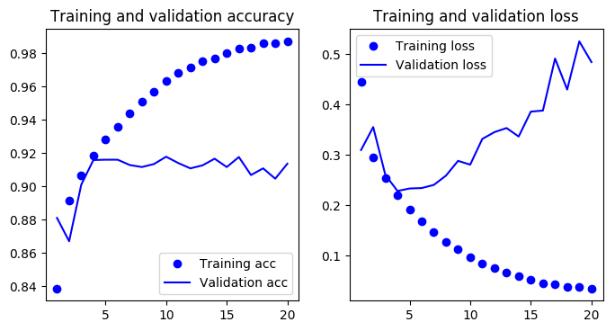 效果一下子出来了,训练精度 98.71% 但是验证精度只有 91.36%,明显的过拟合。画个图看的更明显。