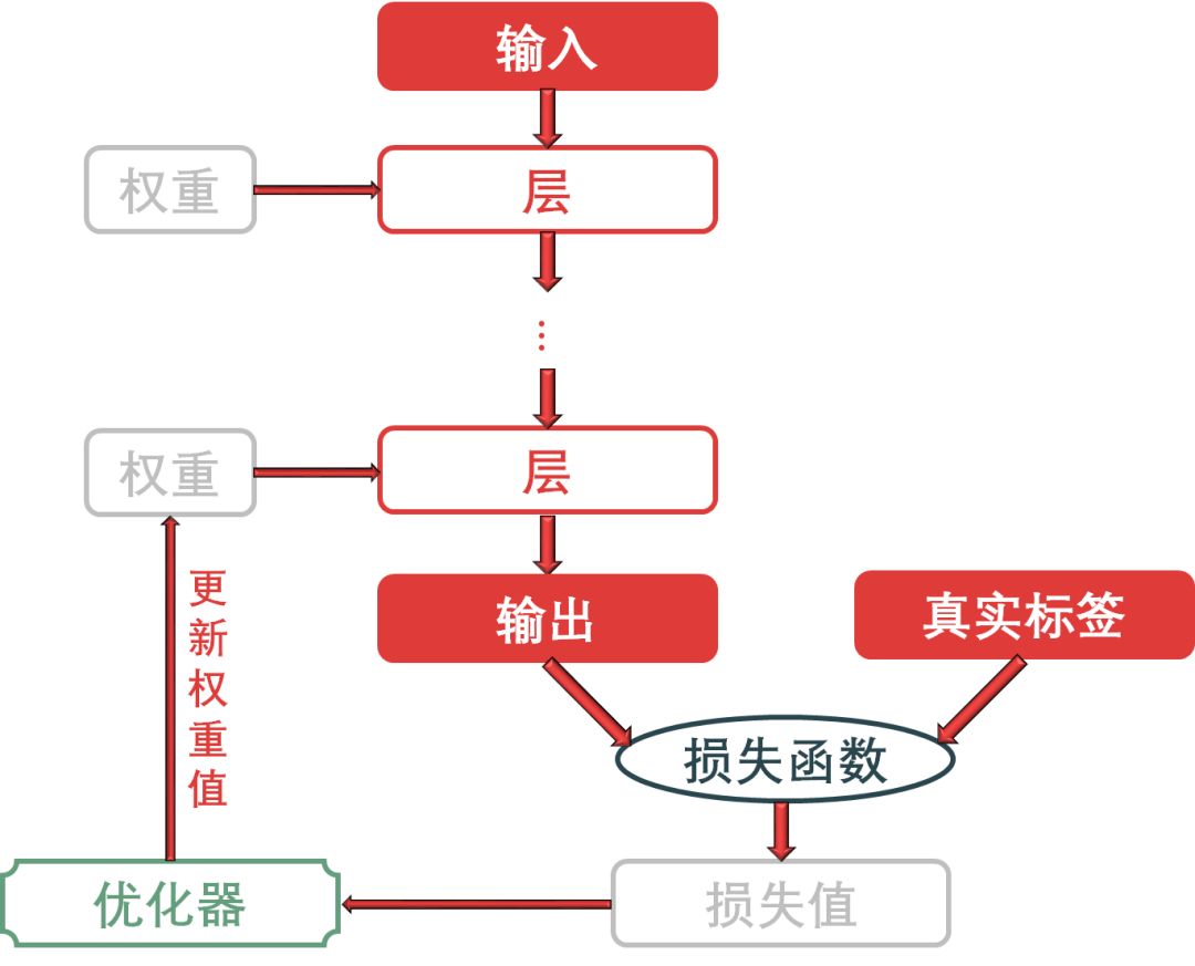 损失函数和算法都会在 Keras 里面都会显性定义出来,带着上面 Scikit-Learn 的图,让我们来看看 Keras 的高层流程。