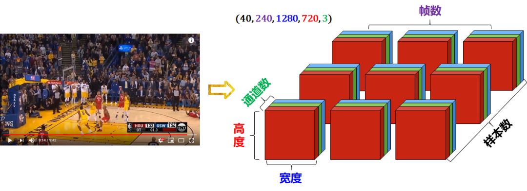 下面一个 9:42 秒的 1280 x 720 油管视屏 (哈登三分绝杀勇士),被分解成 40 个样本数据,每个样本包括 240 帧。这样的视频剪辑将存储在形状为 (40, 240, 1280, 720, 3) 的张量中。