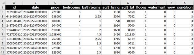 这套房屋 21,000 个数据包括其价格 (y),平方英尺,卧室数,楼层,日期,翻新年份等等 21 栏。该数据形状为 (21000, 21)。传统机器学习的线性回归可以来预测房价。